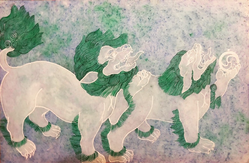 Snows lions in a breeze -Eshay Tobgyal Tibetan art style employs heavy colours. For this painting I used light colours because I wanted to create a soothing effect. Share this: Share on X (Opens in new window) X Share on Facebook (Opens in new window) Facebook Email a link to a friend (Opens in new window) Email Like Loading... Related